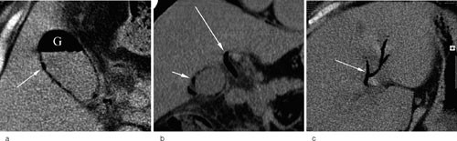 CT abdomen utført to dager etter innleggelsen viste gass i 1/3 av galleblærens lumen samt i ductus hepaticus communis og i intrahepatiske galleganger. Det var også gass i galleblæreveggen, men ikke i peribiliært vev (fig 1a-c). Det var ingen tegn til tumor. Behandling med cefuroksim samt metronidazol ble startet.