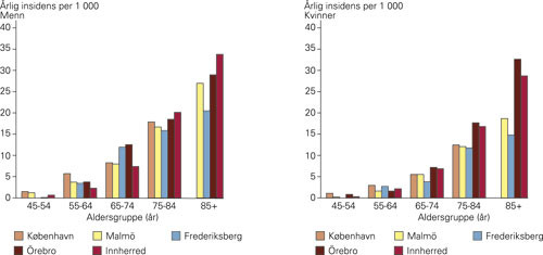Insidenstallene fra Innherred 1994 – 96 samsvarer godt med andre befolkningsbaserte undersøkelser fra Skandinavia utført på 1980- og 90-tallet (fig 1) (1, 5) – (8). Tallene spriker mest i aldersgruppen over 85 år, noe som trolig skyldes metodiske problemer med å fange opp alle slagtilfeller i den eldste aldersgruppen fordi en større andel av de eldste behandles i sykehjem. Validering av prosedyrer for oppsporing av nye tilfeller (case finding) i slagregisteret i Nord-Trøndelag viste at registreringen var komplett i aldersgruppen 15 – 74 år. I aldersgruppen 75 – 84 år og over 85 år fanget metoden opp henholdsvis 87% og 76%.