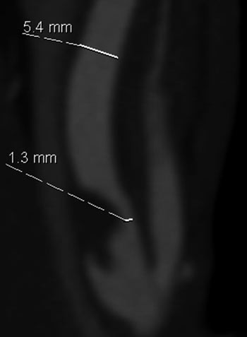 I de senere år har utvikling av MR- og CT-teknologi gitt nye muligheter for ikke-invasiv diagnostikk. CT-angiografi med moderne 64-kanalers spiral-CT gir detaljerte bilder av stenosen og forandringene i karveggen som tromber og kalk, og man får i samme skanning fremstilling av hele forløpet fra aortabuen til intracerebrale kar. Dette er nyttig i forhold til å vurdere egnethet for kirurgi eller stentbehandling. Hos oss henvises nå til ultralydundersøkelse av halskar som første screening, og CT-angiografi gjøres deretter som ledd i preoperativ planlegging. Vi benytter de aksiale originalsnittene til å måle karlumen og visualisere kalk, tromber og ulcerasjoner, for så ved hjelp av koronale og sagittale rekonstruksjoner å beregne stenosegrad på samme måte som ved konvensjonell angiografi (fig 3).