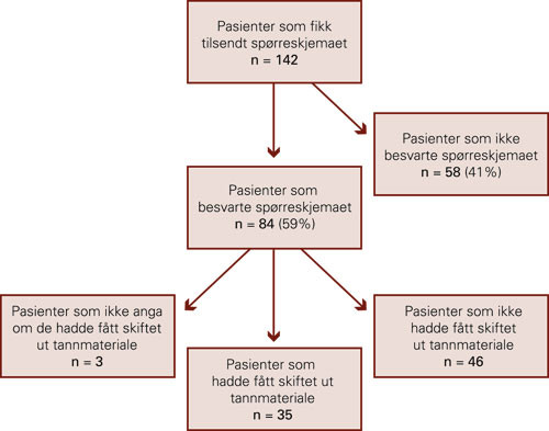 De 84 pasientene som besvarte spørreskjemaet, var gjennomsnittlig eldre enn de som ikke gjorde det (tab 1). Det var derimot ingen signifikant forskjell i svarfrekvens mellom kvinnelige og mannlige pasienter (p = 0,207), og heller ingen forskjeller i indeksene for noen av de oppgitte helseplagene (tab 1). Av dem som deltok i etterundersøkelsen, var det en større andel pasienter som var blitt anbefalt å få skiftet ut dentalt materiale enn pasienter som ikke hadde fått slik anbefaling. Av de pasientene som besvarte spørreskjemaet, hadde 35 (42 %) fått skiftet ut tannmaterialer pga. mistanke om bivirkninger. De fleste av disse hadde skiftet ut amalgamfyllinger (n = 28). Hvilke andre tannmaterialer som ble skiftet ut, fremgår av tabell 2.