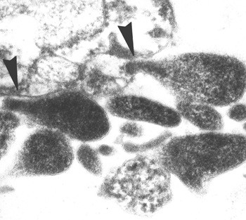 Det å påvise en sammenheng mellom M genitalium og infeksjon i øvre genitaltractus med eventuelle senfølger, som infertilitet og kroniske bekkensmerter, er avgjørende for at infeksjonen skal bli oppfattet som alvorlig. På dette området er det et behov for ytterligere forskning. Imidlertid peker flere studier i retning av at infeksjon med M genitalium er mer enn en ufarlig «snue» i genitalorganene. Mikroben fører til egglederbetennelse etter innpodning på aper (23, 24). Det er vist at M genitalium adhererer til humant egglederepitel i organkulturer (25). Mikroben er også funnet i forbindelse med akutt endometritt (26) (fig 2). I en pasient-kontroll-studie ble infeksjon med M genitalium i endocervix påvist hos 13 % og C trachomatis hos 27 % av 45 kvinner med klinisk diagnostisert bekkeninfeksjon, mens bakterien ikke ble påvist hos noen av de 37 kontrollpersonene. Bare én pasient hadde koinfeksjon med C trachomatis, hvilket støtter teorien om at M genitalium alene kan forårsake øvre genitalinfeksjon/bekkeninfeksjon (27). I en nyere studie har man påvist M genitalium i egglederen hos en kvinne med laparoskopisk diagnostisert akutt salpingitt (28).