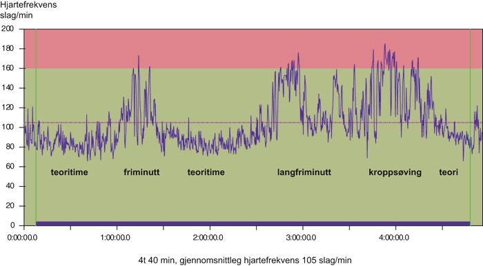 Gjennomsnittleg hjartefrekvens er 90 – 118 slag per minutt for den tradisjonelle skuledagen og 125 – 145 slag per minutt for uteskuledagen. Sjølv om elevane kan ha likt aktivitetsnivå i klasserommet, er det mogleg å delta med svært ulik intensitet i kroppsøvingstimen og friminutta. Dette viser også hjartefrekvenskurvene for enkeltelevar. På uteskuledagen gjekk elevane samla om lag 85 minutt til og frå uteområdet, og aktivitetsnivået var forholdsvis høgt for alle. Dette er eit viktig moment ved plassering av eit uteskuleområde. Området kan liggje nær eller langt frå skulebygningane. Sjølv om vi tek bort forflyttinga til og frå uteområdet, er den gjennomsnittlege hjartefrekvensen klart høgare for uteskuledag utan forflytting enn for den tradisjonelle skuledagen. Det vil seie at elevane er meir fysisk aktive i uteskuleområdet enn på skulen sjølv når den tradisjonelle skuledagen inkluderer ein kroppsøvingstime. Forskjellen er endå tydelegare når uteskuledagen vert samanlikna med aktivitetstypen tradisjonell skuledag utan kroppsøving. Vanlegvis er det flest slike skuledagar.