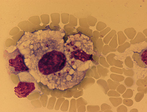 Vår pasient hadde ingen glandelsvulst eller hepatomegali og bare lett forstørret milt. Fravær av splenomegali og lymfadenopati er vanligst hos immunsupprimerte pasienter med hiv (3). Vi påviste verken immunsvikt eller aktuell hivinfeksjon hos vår pasient. Ved revisjon av første beinmargsutstryk var det knapt mulig å oppdage parasittene. Den immunsupprimerende behandlingen bidro nok til å øke parasittantallet, slik at påvisning ble mulig.