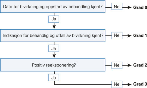 For å vurdere kvaliteten på bivirkningsmeldingene brukte vi WHOs verktøy for dokumentasjonsgradering av spontanrapporterte bivirkninger (fig 1) (12) – (15). Verktøyet er utviklet for å vurdere kvaliteten på meldinger om nye bivirkninger på virkestoffnivå og brukes som et filter for å identifisere meldinger av god kvalitet som kan benyttes i signalgenerering. Dette er det eneste systematiske verktøyet vi kjenner til for slik gradering. Vi satte som tilleggskrav at meldingene skulle inneholde informasjon om produsent av både det preparatet pasienten byttet fra (oftest originalpreparatet) og til (legemidlet mistenkt for å forårsake bivirkning eller endret effekt). Med dette tok vi høyde for behovet for å skille mellom enkeltpreparater, ikke bare virkestoff, i den etterfølgende signalgenereringen. Vi klassifiserte meldinger som ikke inneholdt produsentnavn på tidligere og/eller mistenkt preparat som ikke-graderbare.
