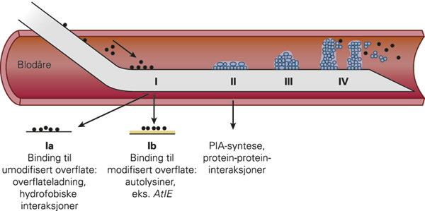 Over 99 % av alle bakterier lever i biofilmer (14). En etablert biofilm er et flersjiktet lag med bakterier omgitt av en ekstracellulær polymerisk substans som kan bestå av polysakkarider, proteiner og DNA (15). Biofilm beskytter bakteriene mot angrep både fra antibiotika og vertens immunforsvar (16, 17). Produksjon av biofilm anses som den viktigste virulensfaktor hos koagulasenegative stafylokokker (fig 1). Disse bakteriene har en rekke adhesjonsmolekyler som medierer binding til overflaten av både fremmedlegemer og eget vev. Deretter starter selve biofilmproduksjonen (1, 2). Hos S epidermidis medierer ica-operonet danning av et eksopolysakkarid kalt polysakkarid intercellulært adhesin (3). Dette polysakkaridet er den viktigste bestanddelen av en S epidermidis-biofilm (17). Biofilmassosiert infeksjon med koagulasenegative stafylokokker ses oftest etter implantatoperasjoner. Denne typen infeksjoner er en enorm medisinsk utfordring (16), men har i liten grad vært omtalt i Tidsskriftet.