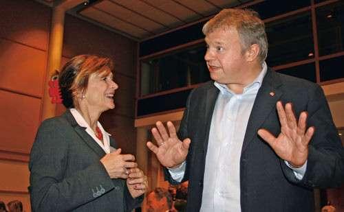 Helseminister Bjarne Håkon Hanssen signaliserte at samhandlingsreformen vil få form av en stortingsmelding. Her i engasjert samtale med Torunn Janbu. Foto Lisbet T. Kongsvik