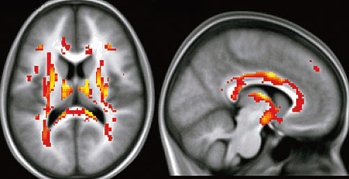 Ved hjelp av såkalt diffusjonstensor-MR visualiserte man organiseringen av hjernefibersubstansen hos barn med svært lav fødselsvekt (1) . I hjernens hvite nervefibersubstans er vanndiffusjonen mye større på langs enn på tvers av nervefibrene. Dette kommer av at cellemembraner og myelinskjeden lager en barriere. Metoden kan derfor benyttes til å kartlegge arkitekturen eller organiseringen av mikrostrukturen i hvit substans.