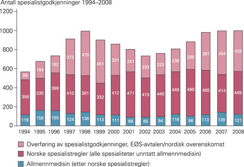 De 998 nye førstegangsgodkjenningene i 2008 er det nest høyeste antallet noensinne, mens det høyeste antallet var 1 007 godkjenninger i 2007. Det tredje høyeste var i 1998. Da ble det gitt totalt 989 spesialistgodkjenninger, men bare 519 var godkjenninger etter norske regler. I 2008 var det 428 konverteringer fra EU/EØS. Den lille nedgangen i det totale antallet godkjenninger fra 2007 til 2008 skyldes først og fremst nedgang i overføringer av spesialitet fra Sverige, Tyskland, Island og Ungarn. I 2007 fikk vi de første overføringene av spesialitet fra de to nyeste EU-landene, Romania og Bulgaria. I 2008 er det en økning i antallet overføringer fra disse to landene.