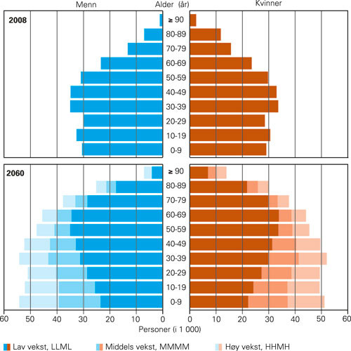 Ved første blikk ser det ut til at helsetilstanden er bra hos eldre: I perioden 1985 – 2005 økte andelen «unge eldre» (65 – 74 år) med meget god eller god helse fra 59 % til 71 % for menn og fra 54 % til 70 % for kvinner (4). Imidlertid opplever så mye som 30 % av «unge eldre» mindre god eller dårlig helse. Statistisk sentralbyrås fremskrivning viser dessuten at de store folkesykdommene vil øke med 40 – 60 % frem til 2030. Denne økningen skyldes i hovedsak demografiske endringer og rammer aldersgruppen 65 år og eldre (5). Fremskrivning til 2020 av de vanligste kreftformene i aldersgruppen over 75 år peker mot kraftig økning, sterkest for brystkreft hos kvinner. Lungekreft er foreløpig hyppigere hos menn enn hos kvinner, men forskjellen avtar fra år til år (6).