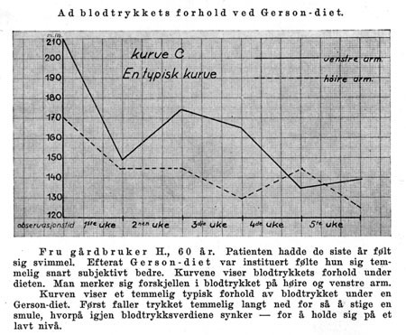 Vi må få blodtrykket til å falle, og til dels temmelig meget. Det kan skje på mange måter, for eksempel ved veneseksjon, ved medikamenter – ofte bare ved ro, ferie, sengeleie, regulert regime og noget innskrenket diet. Men vårt inntrykk er, at Gersondieten virker kraftigere enn de andre metoder. Blodtrykket faller raskere og fallet har tendens til å være varig – i allfall så lenge dieten blir gjennemført og så lenge vi har hatt anledning til å følge patienterne. Og det som for oss har vært det mest bemerkelsesverdige, er at tross det til dels svære og plutselige fall av blodtrykket har det subjektive befinnende som regel vært helt udmerket. Uttalelser som «jeg føler mig nu bedre enn på mangfoldige år», «føler mig 10 år yngre» og lignende har vært rett hyppige. På bakgrunn av en 25-årig erfaring med fysikalsk og dietetisk behandling av disse tilstander må det vel dog tillegges nogen betydning, at vi ved Midtstuen Sanatorium mener å se en vesentlig større nytte av Gersondieten enn av tidligere anvendte behandlingsmåter. I et par tilfeller, hvor der allerede lenge hadde vært anvendt saltfattig diet, medikamentell behandling og fysikalsk behandling, men tilstanden var stasjonær, har institueringen av Gersondiet bragt yderligere fall af blodtrykket sammen med økt velbefinnende og øket dyktighet (til å spasere og arbeide).