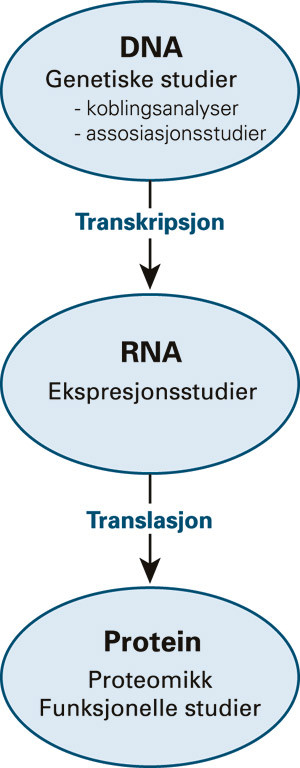 Genetiske studier gjøres på DNA-nivå, mens ekspresjonsstudier (som gir informasjon om geners aktivitet) gjøres på RNA-nivå. Proteomikk er studien av proteiners struktur og funksjon. Funksjonell genomforskning (genomikk) beskriver geners og proteiners funksjoner og interaksjoner (fig 1). Det er identifisert mange millioner steder i genomet der enkeltnukleotider i DNA-sekvensen kan variere mellom to mennesker. Disse variantene kalles polymorfismer. Som markører i genetiske studier benyttes ofte enkeltbasevarianter (single nucleotide polymorphisms). De fleste har ingen funksjonell effekt, men noen kan påvirke disposisjon for sykdom.