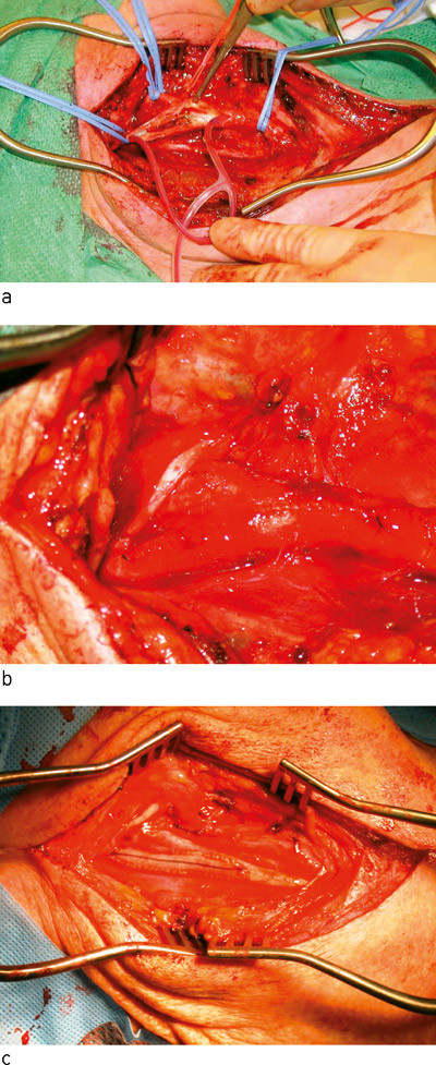 Trombendarterektomi gjøres i generell anestesi. Platehemmerbehandling kontinueres uten avbrudd, men kombinasjon av acetylsalisylsyre og klopidogrel er ikke innført som rutine. Det gis i tillegg 5 000 IE heparin peroperativt. Vi bruker rutinemessig shunt fra a. carotis communis til distale a. carotis interna (fig 1a), og hjernen monitoreres med INVOS Cerebral Oximeter (Somanetics Corporation), eller transkranial doppler med hastighetsmåling i arteria cerebri media og embolideteksjon. Det gjøres endarterektomi via langsgående arteriotomi (fig 1a). Distale intimakant festes med suturer før arteriotomien lukkes direkte med fortløpende 7–0 Prolene (fig 1b). Dersom karet har lite kaliber, brukes en polyesterlapp (Hemashield Finesse (Boston Scientific Corp)) (fig 1c).