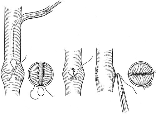 Refluks i overflatiske vener og perforanter oppheves ved kirurgisk eksisjon eller ligatur av affiserte vener. Dyp venøs refluks krever enten kirurgisk reparasjon (klaffeplastikk) eller erstatning av de ødelagte klaffene (autotransplantasjon, ev. lokal kirurgisk konstruksjon av ny veneklaff ved bruk av veneveggens intima (neoklaff) (7–10) (fig 1–3). Dersom det foreligger insuffisient rekanalisering etter tidligere dyp venøs trombose, må slik venøs obstruksjon korrigeres før dyp venøs rekonstruksjon, hvor den vanligste prosedyren er endovaskulær rekanalisering og stenting av bekkenvene (11). Kirurgisk behandling av dyp venøs refluks varierer avhengig av etiologien. Ved primær (ukjent årsak, familiær belastning) kronisk venøs insuffisiens er ekstern eller intern klaffeplastikk indisert, mens det hos pasienter med sekundær (posttrombotisk) kronisk venøs insuffisiens er nødvendig med veneklafftransplantasjon eller veneklaffkonstruksjon kombinert med transposisjon. Venøs obstruksjon behandles endovaskulært med rekanalisering og stenting.