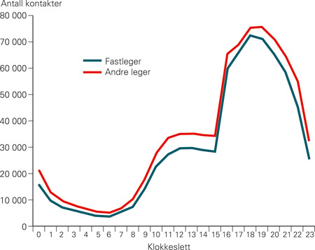 Det var i alt 1 520 474 kontakter – 77,2 % konsultasjoner, 5,8 % sykebesøk, 16,0 % telefonkontakter og 1,0 % enkle kontakter. Fastlegene sto for 46,6 % av kontaktene, andre leger for 53,4 %. Figur 1 og figur 2 viser hvordan kontaktene fordelte seg gjennom døgnet og gjennom året for fastlegene og for andre leger. Det var flest kontakter (64,0 %) ettermiddag og kveld (kl 16–24), mens 8,7 % av kontaktene fant sted om natten (kl 00–08). Det var ingen forskjell i døgnvariasjon mellom fastleger og andre leger, men i sommerferien (juli måned) sto fastlegene for bare 37,5 % av kontaktene. Fastlegene hadde forholdsvis flere enkle kontakter og telefonkontakter, de andre legene forholdsvis flere konsultasjoner og sykebesøk (tab 1). Andre leger hadde forholdsvis flest kontakter i de store og sentrale kommunene (tab 2).
