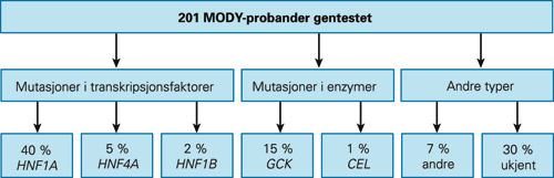 En annen tilnærming har vært posisjonell kloning. Ved denne teknikken brukes genetiske koblingsanalyser for å finne et genområde som nedarves sammen med diabetes i en eller flere familier. Når et slikt genområde er identifisert, undersøkes de genene som befinner seg innen dette området med DNA-sekvensering. Slik fant man genet HNF1A, som koder for hepatocyttnukleærfaktor-1-alfa (11). Mutasjoner i dette genet forårsaker HNF1A-MODY, den vanligste formen for monogen diabetes i Norge (fig 1) (12) – (18). Et annet eksempel er CEL, som koder for enzymet karboksylesterlipase. Mutasjoner i dette genet leder til CEL-MODY (12). I mange tilfeller har posisjonell kloning gitt helt ny viten. Det var ikke kjent at HNF1A var uttrykt i betacellene i pancreas (11). CEL, som er ansvarlig for hydrolyse av kolesterolestere, er ikke uttrykt i betacellene, men derimot i acinærcellene (12).