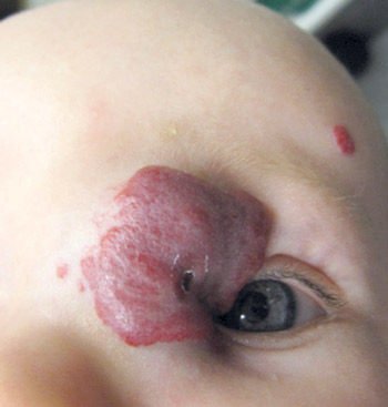 Ved undersøkelse ble det lagt merke til en rød elevert tumor i venstre mediale øyevinkel (fig 1). Tumoren var 3 x 3,4 cm stor og strakte seg opp til øyebrynet og over neseryggen, og det var begynnende vekst over venstre synsfelt. Lesjonen dekket nasale del av iris, og øyelege anmerket astigmatisme, som sannsynligvis skyldtes tumoren. De kliniske funn var forenlig med periokulært infantilt hemangiom. Det var ingen sikre holdepunkter for utvikling av amblyopi. Pasienten hadde også hemangiom i overgangen mellom høyre labia majora og perineum, på nedre del av abdomen og i venstre side av pannen.