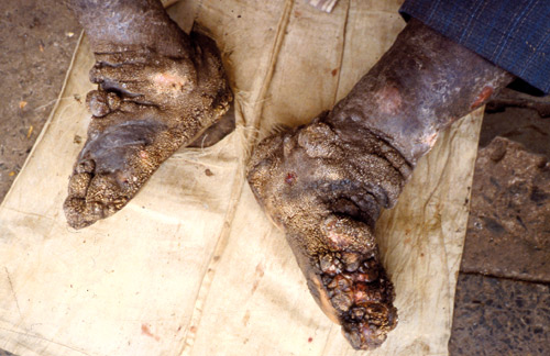 Den forekommer hyppigst i høytliggende områder og blant landarbeidere. Sykdommen skyldes at man går barbeint i jord av vulkansk opprinnelse, særlig rød leirjord, som inneholder silisiumforbindelser. Mikroskopiske silikatpartikler trenger inn i huden og forårsaker en betennelsesreaksjon i lymfeårer som obstrueres. Progredierende lymfeåreskade med spredning til leggene forekommer. Lårene er sjelden involvert, men ingvinale lymfeknuter kan affiseres. I huden utvikles moseliknende hyperkeratoser og fibrose og sekundært lymfødem. Hudforandringene kan bli store og omfatte tærne som blir stive. Illeluktende superinfeksjon med bakterier og sopp samt sårdannelser er vanlig og kan spre seg til dypere lag inkludert fotens knokler. Vond lukt fra infeksjoner gjør at sykdommen er sosialt stigmatiserende.