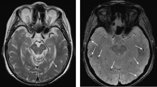 Mikroblødninger kan føre til residiverende episoder med transitoriske nevrologiske utfall. Blødningene etterlater hemosiderinavleiringer kortikalt-subkortikalt. Disse visualiseres ikke på CT og er vanskelig å se på vanlige MR-bilder. Bildet til venstre viser en mulig avleiring på venstre side, markert med pil, som ble tolket som uspesifikk, ellers normale funn. Symptomene mistolkes ofte som transitoriske iskemiske attakker (TIA). Gjentatte mikroblødninger kan fører til langsomt progredierende demens.
