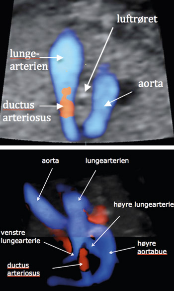 Tidlig i fosterlivet finnes det to aortabuer, men vanligvis tilbakedannes den høyre. Noen ganger persisterer begge aortabuene (vaskulær ring) eller det er den venstre som tilbakedannes. Trachea og oesophagus blir i disse tilfellene liggende mellom aorta og lungearterien. Figur 1 og 2 og tilhørende videoer , som finnes til denne artikkelen på www.tidsskriftet.no , viser et eksempel på persisterende høyre aortabue. Studier i den voksne befolkningen har vist en prevalens på 1 %, men persisterende høyre aortabue påvises bare hos ca. 0,1–0,2 % ved ultralydundersøkelse av foster. Tilstanden kan være forbundet med kompliserte hjertefeil. Prognosen er vanligvis god ved isolert persisterende høyre aortabue, og man forventer ikke problemer i svangerskapet. Kompresjon av oesophagus og trachea kan gi problemer etter fødselen, og barnelege bør derfor være til stede ved fødselen. Hvis tilstanden forekommer i kombinasjon med andre fosteravvik, er det økt sannsynlighet for kromosomavvik som trisomi 21 eller DiGeorges syndrom.