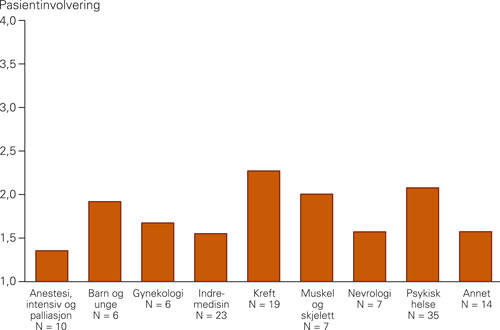 De 127 retningslinjene som ble vurdert, var utviklet av 26 ulike institusjoner og organisasjoner. Emnet «Pasientenes synspunkter og ønsker er forsøkt inkludert» fikk en gjennomsnittsskår på 1,8 (95 % KI 1,7 – 2,0), som tilsvarer 28 % av maksimalt oppnådd skår. Emnet «Pasientinvolvering» skåret signifikant lavere enn gjennomsnittet av hele hovedområdet om involvering av interessenter. Retningslinjer produsert av institusjoner innen offentlig helseforvaltning skåret høyere på pasientinvolvering enn retningslinjer laget av fagmedisinske foreninger og organisasjoner, gjennomsnittlig 2,4 (KI 2,1 – 2,7) versus 1,5 (KI 1,2 – 1,7). Retningslinjer om kreft, psykisk helse, muskel- og skjelettsykdommer og barn og unge hadde høyest gjennomsnittlig skår for pasientinvolvering (fig 1). Det var ingen signifikant forskjell mellom eldre retningslinjer (fra 2000 – 05), som skåret 1,8 (KI 1,6 – 2,0), og nyere retningslinjer (fra 2006 – 09), som skåret 1,9 (KI 1,7 – 2,2).