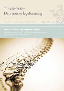 Forsidebildet Vri og vende () sporsmal_grey_rgb Artikkel Foto Istockphoto Vertebra kommer fra det latinske verbet vertere (vri, vende). Det at ryggraden er bygd opp av enkeltstående ryggvirvler, gir oss en fascinerende evne til å vri og vende på denne i utgangspunktet rigide strukturen. Den samme fleksibiliteten kan også gi oss plager. I dette nummer av Tidsskriftet starter en Temaserie om muskel- og skjelettlidelser. Kommentarer ( 0 ) Dette kommentarfeltet modereres, men kommentarer blir ikke redaksjonelt behandlet ut over å sikre at de følger retningslinjer for vårt kommentarfelt. Denne artikkelen ble publisert for mer enn 12 måneder siden, og vi har derfor stengt for nye kommentarer. Publisert: 4. november 2010 Utgave 21, 4. november 2010 Tidsskr Nor Legeforen 4. november 2010 130 : 2093 Publisert: 4. november 2010 Utgave 21, 4. november 2010 Tidsskr Nor Legeforen 2010 130 : 2093 PDF Får du ikke vist PDF-filen eller vil lagre filen, kan du høyreklikke på PDF-ikonet. Velg «Lagre mål/fil som..» og hent så opp PDF-filen i for eksempel Acrobat Reader. Skriv ut Anbefalte artikler