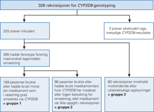 Prøvedatabasen ved Senter for medisinsk genetikk og molekylærmedisin ved Haukeland universitetssykehus ble brukt for retrospektivt å identifisere alle rekvisisjoner med forespørsel om gentesting for CYP2D6 f.o.m. 29.6. 1998 t.o.m. 28.12. 2009. 328 prøver ble vurdert – 325 ble inkludert, mens tre ble ekskludert pga. tvetydig resultat av CYP2D6-genotypingen (fig 1). Basert på en samlet vurdering av opplysningene i rekvisisjonen ble den aktuelle problemstilling registrert som mistanke om enten langsom legemiddelomsetning eller ultrarask legemiddelomsetning. Der opplysningene var utilstrekkelige eller motstridende, ble problemstillingen registrert som «uklar». I tillegg ble medikamenter, dose og serumkonsentrasjon registrert – i de tilfellene det forelå opplysninger om dette. Rekvisisjonene ble deretter kategorisert i tre ulike grupper basert på de registrerte dataene (tab 1). Resultatet av genotypingen var ikke kjent for den som utførte klassifiseringen av gruppetilhørighet. Kategorisering av problemstilling og indikasjonsgrupper ble primært utført av en av forfatterne (HHV), inndelingen ble deretter kontrollert av prosjektleder (VMS). Det ble oppnådd enighet om kategoriseringen i alle tilfeller. Rekvisisjoner i gruppe 1 hadde fenotype forenlig med unormal legemiddelomsetning, i tillegg hadde pasientene brukt minst ett medikament hvor CYP2D6 er av vesentlig betydning for nedbrytningen (e-tab 2) (6, 15, 16). Gruppe 2 besto også av rekvisisjoner med opplysninger om fenotype forenlig med unormal legemiddelomsetning, men medikamentet som var oppgitt, nedbrytes kun i moderat eller ingen grad av CYP2D6 eller medikament var ikke oppgitt. Rekvisisjoner med få, ingen eller helt motstridende opplysninger ble kategorisert til gruppe 3.