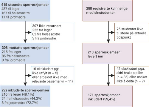 Vi ønsket å stille tilsvarende spørsmål til en gruppe p-pillebrukere. Samtidig som vi sendte ut spørreskjemaet til forskriverne, delte vi derfor også ut spørreskjemaer til kvinnelige medisinstudenter i de fire laveste årskullene ved Det medisinske fakultet, Norges teknisk-naturvitenskapelige universitet. Denne delen av undersøkelsen ble godkjent av Regional komité for forskningsetikk Midt-Norge. Skjemaet ble delt ut i pausen mellom to forelesninger og samlet inn i en lukket eske. Svarene var anonyme. Svarprosenten for studentene er beregnet med utgangspunkt i det totale antallet kvinnelige studenter på de respektive kullene, i alt 288 personer (fig 1).