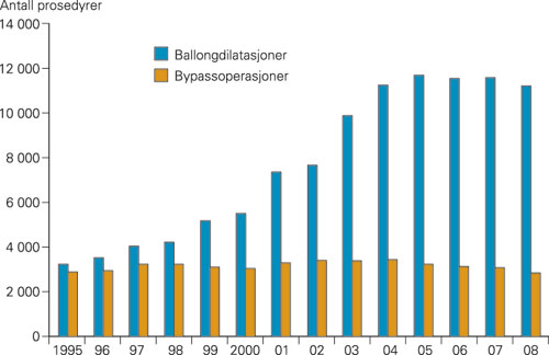 Figur 1 Utviklingen i koronarkirurgi og ballongdilatasjon (PCI) 1995 – 2008