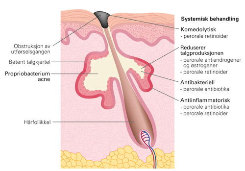 Systemisk behandling, oftest med tetrasykliner, gjerne i kombinasjon med lokalbehandling, er nødvendig ved moderat til alvorlig akne. Ved manglende effekt, særlig ved alvorlig og arrdannende sykdom, bør pasienten henvises til hudlege for vurdering av systemisk behandling med isotretinoin.