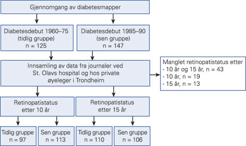 Vi identifiserte 125 personer med diabetesdebut i årene 1960 – 75 (tidlig gruppe) og 147 med debut i årene 1985 – 90 (sen gruppe). Retinopatistatus ble registrert hos 210 personer (77 %) etter ti år og hos 216 (79 %) etter 15 år med diabetes (fig 1). For 43 personer (16 %) fant vi ingen informasjon om retinopatistatus, og disse er utelatt fra de videre analysene. Hovedårsakene til manglende informasjon om retinopatistatus var at pasienten var flyttet fra Trondheim og/eller at resultatet av utført øyebunnsundersøkelse manglet i journalene. Det var kun én person som ikke hadde vært til øyelegeundersøkelse rundt ti år eller rundt 15 år etter diabetesdebut.
