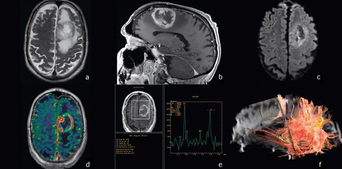 Høygradige gliomer vokser raskt og gir progredierende symptomer som utvikles i løpet av uker eller måneder. Fokale nevrologiske utfall, nyoppstått epilepsi, vedvarende nyoppstått eller endret hodepine eller mental endring hos en voksen bør gi mistanke om hjernesvulst (2). Det bør da gjøres magnetresonanstomografi (MR) med og uten kontrast. Hvis mistanken om hjernesvulst bekreftes, bør pasienten straks henvises til sykehus med spesialister i nevroradiologi og nevrokirurgi, som kan vurdere videre utredning. Blant annet er MR-spektroskopi (MRS) og diffusjonsvektet MR (DWI) nyttig for å skille høygradig gliom fra lavgradig gliom, hjerneinfarkt og hjerneabscess (3). Funksjonell MR (fMRI) og MR-traktografi (DTI) er nyttige preoperative undersøkelser hos pasienter med svulster i nær relasjon til språkområdene, motorisk hjernebark, synsbark og pyramidebanene (fig 1).
