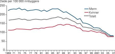 Totaldødeligheten av hjerteinfarkt økte svakt i 1970- og 1980-årene og toppet seg i 1987 (189 døde per 100 000 innbyggere) (fig 1). Økningen i totaldødelighet i denne perioden skyldes økning i dødeligheten blant kvinner. Fra 1987 falt totaldødeligheten frem til 2007, da vi observerte det laveste nivået i analyseperioden (79,7 døde per 100 000 innbyggere). Totaldødeligheten ble mer enn halvert i 20-årsperioden etter 1987. I denne perioden var fallet i dødelighet sterkere blant menn (– 64 %) enn blant kvinner (– 47 %). I 2007 var totaldødeligheten (ikke aldersjustert) av hjerteinfarkt blant menn 9 % høyere enn blant kvinner.