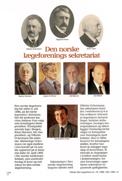 Tidligere i Tidsskriftet Da Legeforeningen var 100 år Marit Fjellhaug Nylund Om forfatteren Se alle artikler Marit Nylund Email: marit.nylund@legeforeningen.no Tidsskriftet () sporsmal_grey_rgb Artikkel Tidsskriftet nr. 14/1986 var et jubileumsnummer med mange artikler om Legeforeningens rolle i samfunnet, gratulasjoner fra ulike legemiddelfirmaer og en historisk gjennomgang av foreningens strukturer. Her vises Legeforeningens generalsekretærer i perioden 1886 – 1986 (Tidsskr Nor Lægeforen 1986; 106: 1260). Kommentarer ( 0 ) Dette kommentarfeltet modereres, men kommentarer blir ikke redaksjonelt behandlet ut over å sikre at de følger retningslinjer for vårt kommentarfelt. Denne artikkelen ble publisert for mer enn 12 måneder siden, og vi har derfor stengt for nye kommentarer. Publisert: 20. mai 2011 Tidsskr Nor Legeforen 20. mai 2011 doi: 10.4045/tidsskr.11.0482 PlumX 131 : 981 Publisert: 20. mai 2011 Tidsskr Nor Legeforen 2011 131 : 981 doi: 10.4045/tidsskr.11.0482 Plum Print visual indicator of research metrics PlumX Metrics PDF Får du ikke vist PDF-filen eller vil lagre filen, kan du høyreklikke på PDF-ikonet. Velg «Lagre mål/fil som..» og hent så opp PDF-filen i for eksempel Acrobat Reader. Skriv ut Anbefalte artikler