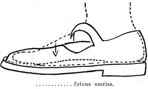 Eftersom de grovere hygienske feil (skader) overvinnes, tiltar de mindre viktige relativt i betydning. Jeg vil tillate mig å peke på en sådan, nemlig de barnesko som nu fremstilles. De er nemlig praktisk talt uten undtagelse så lave fortil at fothvelvingen må presses ned for å få foten inn. (Som tegningen forsøker å vise). Da jeg deltok i fysikatkurset 1933 forsøkte jeg ved et besøk på et daghjem å vise dette for Oslo skolelægechef (og barnene der hadde akkurat sådanne sko); men saken syntes ham visst for ubetydelig. Personlig kan jeg vanskelig løsrive mig fra den opfatning at hyppigheten av plattfot må kunne bringes ned ved hensiktsmessig skotøi i barneårene (og ungdomsårene).