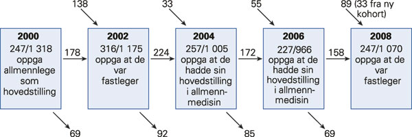 Data kommer fra Forskningsinstituttets referansepanel, et tilnærmet representativt utvalg på ca. 1 600 yrkesaktive leger som annethvert år siden 1994 er fulgt med postale spørreskjemaer. I denne artikkelen benyttes data fra 2000, 2002, 2004, 2006 og 2008. Som vist i figur 1 er det ganske stor utskiftning i allmennlegegruppen fra gang til gang. Dette skyldes at noen blir pensjonister eller trekker seg fra panelet og at en del skifter jobb. Dessuten svarer ikke alle paneldeltakere på undersøkelsen hver gang. I 2008 ble panelet utvidet med en tilfeldig gruppe yngre leger som hadde fått autorisasjon etter 2000, og 33 av disse oppga at de var fastleger. 119 leger, 32 kvinner og 87 menn, var allmennleger i 2000 og fastleger i 2008 og utgjør en «veterangruppe». For å vurdere utvalgets representativtet i forhold til alder, kjønn og bosted, samt anslå svarprosent, benyttet vi også data fra Legeforeningens Internett-baserte statistikkbank (11).