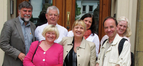 Samling utenfor Domus Medica, DADLs flotte hovedkvarter. Foran fra v. Kirsti Pakkala (Finland) Bernadette Guldager (Danmark, Jan-Anders Nyman, (Finland). Bak: Øystein M. Christiansen og Finn Nilsson, (Norge), Lone Kjær og Susanne Quistgaard,(Danmark).