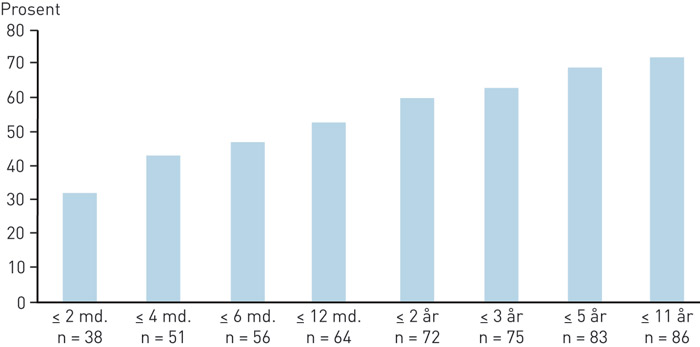 I aldersgruppen 40 – 49 år var median tid til tilbakefall 30 måneder. Hos dem over 50 år var medianen 2 – 4 måneder (e-tab 1).