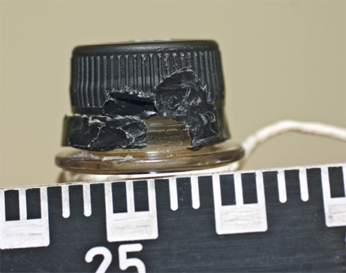 Vi bisto politiet med en gasskromatografisk-massespektrometrisk (GCMS) analyse av flaskens innhold. Metoden, som også brukes i toksikologiske analyser ved rettslige obduksjoner, består i at stoffet varmes opp mens det transporteres med inert gass gjennom et rør (kolonne), der molekyler separeres etter kokepunkt og polaritet. Stoffer med lavt kokepunkt vandrer raskere gjennom kolonnen enn stoffer med høyt kokepunkt. Etter hvert som enkeltstoffene kommer ut av kolonnen, registreres de som kromatografiske topper. Deretter fragmenteres og ioniseres stoffene i et vakuumkammer, og ionene som oppstår akselereres, filtreres og registreres i et massespektrometer. Hvert stoff danner sitt unike massespekter, et slags fingeravtrykk, som kan sammenliknes med et referansebibliotek av ca. 200 000 kjente forbindelser for å identifisere ukjente stoffer. Vi analyserte også en normal brusflaske av samme merke for sammenlikning.