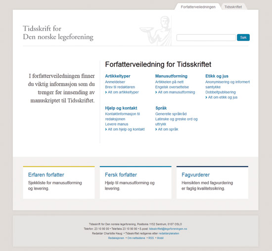 Nylig er vår forfatterveiledning oppdatert og er blitt mer brukervennlig (4) . Her finnes bl.a. oversikter over artikkeltyper, manusutforming, etikk og jus, informasjon om forfatterskap, rettigheter og interessekonflikter.