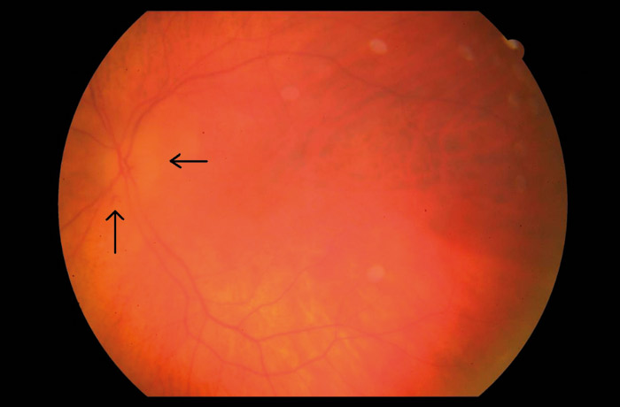 En 87 år gammel kvinne med kjent bilateral carotisstenose, hypertensjon og hjertesvikt hadde i flere uker smerter over begge tinninger, spesielt mens hun spiste. Utover dette hadde hun ikke hodepine. Hun ble henvist øyeavdeling med mistanke om netthinneløsning etter at hun akutt mistet synet på venstre øye. Undersøkelse viste papillødem, peripapillær blødning og iskemisk preg langs arkadene nedenfor macula på venstre side (forenlig med mulig temporalisarteritt) (bildet til venstre) (piler) og velavgrenset papill på høyre side (bilde kun i Tidsskriftets nettutgave).