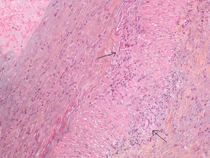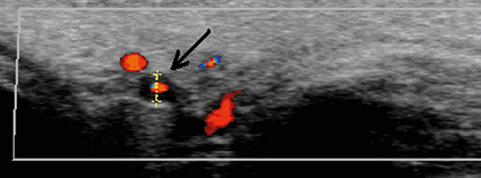 Pasienten ble innlagt i Nevrologisk avdeling med mistanke om sentralarterieokklusjon eller temporalisarteritt. Nevrologisk undersøkelse var upåfallende, med unntak av visustap venstre side. Pasienten hadde ikke hodepine. Temporalisarterien var verken hoven eller trykkøm, CRP var 19 mg/l (referanseverdi < 5 mg/l) og senkningsreaksjonen var 25 mm/t (referanseverdi < 30 mm/t). Ultralydundersøkelse av temporalarterien viste hypoekkoisk halo i arterieveggen som tegn på veggødem (bildet til høyre). Biopsi viste kjempeceller samt inflammatoriske forandringer i og rundt arterieveggen (bilde kun i Tidsskriftets nettutgave) og bekreftet diagnosen temporalisarteritt.