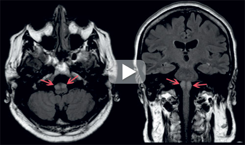 En mann i 50-årene med Graves’ sykdom ble rammet av en hjernestammebetennelse av ukjent etiologi. Tilstanden stabiliserte seg, men høysignalforandringene som initialt ble sett på MR, hovedsakelig i øvre og midtre del av hjernestammen, forble relativt uendret. Fire måneder etter den første undersøkelsen hadde det imidlertid tilkommet hypertrofi og signalforandring svarende til nucleus oliva inferior bilateralt (MR-bilder). Pasienten hadde begynt å høre klikkelyder i hodet, og ved klinisk undersøkelse hadde han rytmiske sammentrekninger bak i svelget. Se video på nett for fullstendig fremstilling.