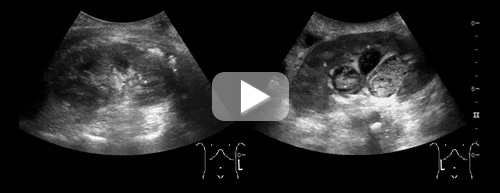 På figuren ser man pasientens normale venstre nyre til venstre. Til høyre ser man den hydronefrotiske høyre nyren med tydelig ekkogent innhold. Se video på nett for fremstilling av hele nyren, der man også kan se proksimal pyoureter.