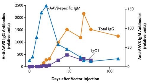 Pasientene fikk genoverføring i form av kun én intravenøs injeksjon av adenovirusassosiert virusvektor som uttrykte faktor IX. Pasientene fikk henholdsvis lav, intermediær eller høy dose vektor. Observasjonstiden var 6 – 16 måneder og alle pasientene uttrykte faktor IX-aktivitet mer enn fem måneder etter genoverføring. Fire av pasientene kunne avslutte tilførsel av profylaktisk faktor IX-konsentrat i løpet av observasjonstiden, og de to siste fikk redusert behovet.
