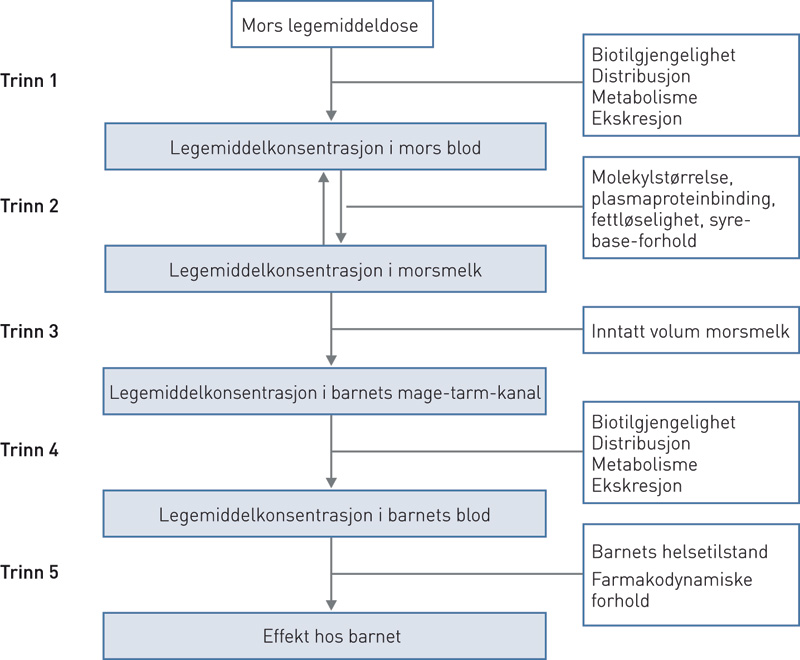 For at et brysternært barn skal få en farmakologisk effekt av et legemiddel som mor bruker, må legemidlet passere en rekke trinn (fig 1) (1) – (3). Legemidlet må tas opp systemisk hos kvinnen slik at det oppnås en viss plasmakonsentrasjon (trinn 1). Legemidler som tas peroralt eller injiseres, gjenfinnes i størst grad i melken. Mange lokalt virkende legemidler (salver, kremer, inhalasjonsmidler, øyedråper, nesesprayer, vagitorier og liknende) vil som regel ikke gjenfinnes i mors blod i nevneverdige konsentrasjoner, og dermed heller ikke i melken.