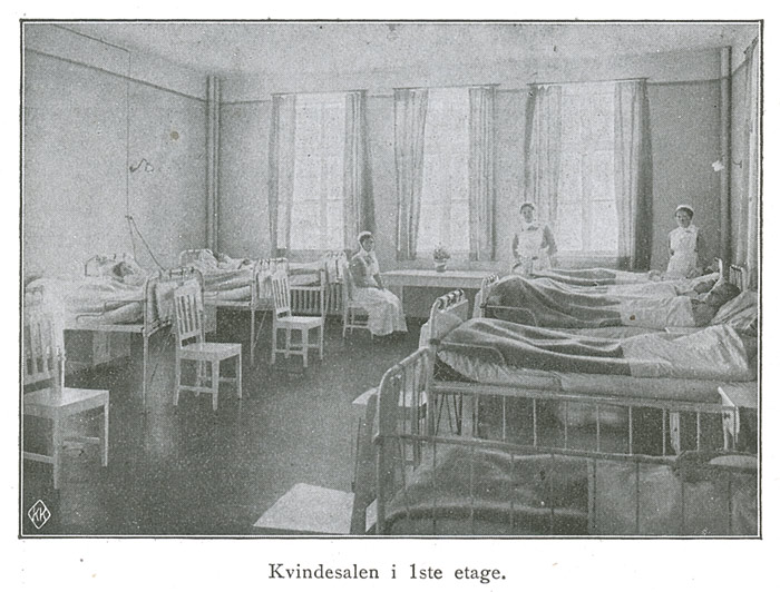 I 1ste etage: 7 sykeværelser med tils. 30 senger, garderobe, anretning, 2 bad, W.C., skyllerom, magasinrum, kontor , laboratorium og spiserum for søstrene.