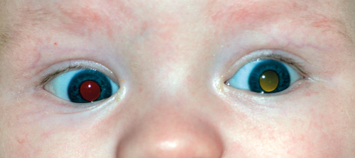 Med dette i tankene har jeg i ettertid sett igjennom bilder vi har tatt av barnet, og da kan man på noen av bildene se at det på høyre øye er fin rød refleks, mens det på venstre er mer hvit pupill (leukokori) (fig 1 og 2). Det var allikevel også flere bilder med normal rød refleks bilateralt. Jeg kan ikke gjenfinne leukokori på bilder av tvillingbroren. For øvrig, som det er gjort et poeng av i en artikkel i The Lancet nylig (1) , vil dagens fotokameraer ofte ha en funksjon for anti-rødøyne, som gjør det vanskeligere å oppdage leukokori på bilder.