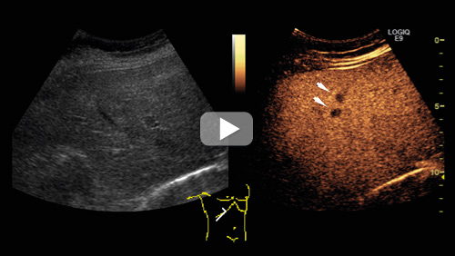På bildet over til venstre vises et konvensjonelt ultralydbilde gjennom leveren, til høyre det korresponderende kontrastforsterkede bildet. Det kontrastforsterkede bildet er tatt i sen kontrastfase, og man kan se flere typiske metastaser som mørke flekker på lys bakgrunn (se video på nett for fremstilling av hele høyre leverlapp). Eksemplet viser en metastase fra tykktarmskreft. Det er betydelig lettere å identifisere metastasene på de kontrastforsterkede bildene.