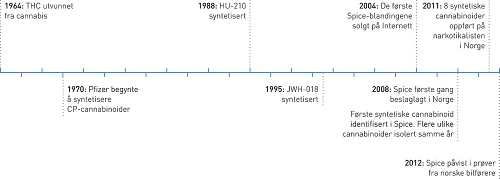 Δ⁹-tetrahydrocannabinol (THC) er den viktigste psykoaktive substansen i cannabisprodukter som hasj og marihuana (10). Syntetisk fremstilt THC (dronabinol) brukes i noen grad i medisinsk behandling, blant annet i Danmark. Etter at THC ble isolert i 1960-årene, er en rekke syntetiske cannabinoidreseptoragonister blitt utviklet, hovedsakelig til smertebehandling (fig 1). Kun et fåtall av de syntetiske cannabinoidene brukes i medisinsk behandling (ett eksempel er nabilon), og verken THC eller syntetiske cannabinoider er tillatt markedsført i Norge. Dette er hovedsakelig fordi det har vært vanskelig å skille ønskede effekter fra uønskede psykoaktive effekter (11). Noen syntetiske cannabinoider er THC-analoger, men mange er også strukturelt forskjellig (fig 2).