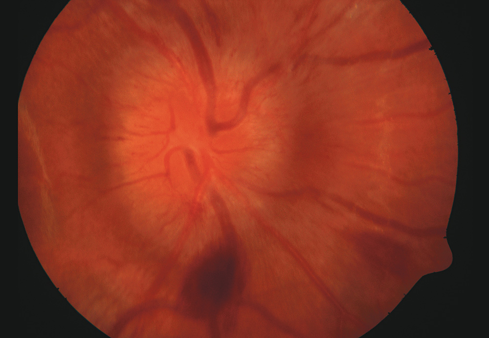 Flere uker senere ble pasienten igjen akutt dårlig, og det ble påvist nye cerebrale infarkter. Nå hadde han synsforstyrrelser, og det var defekter i synsfeltet på begge øyne. Ved øyeundersøkelse ble det påvist økende papillødem med ferske blødninger rundt papillen på begge øyne. Bildet viser papillødemet og blødningene på høyre øye. Vi har dessverre ikke bilder av perifer del av netthinnen. Pasienten ble også denne gangen bedre etter behandling med steroider og cyklofosfamid. En måned senere var papillødem og blødninger i retina forsvunnet, og det var kun en liten defekt i synsfeltet.